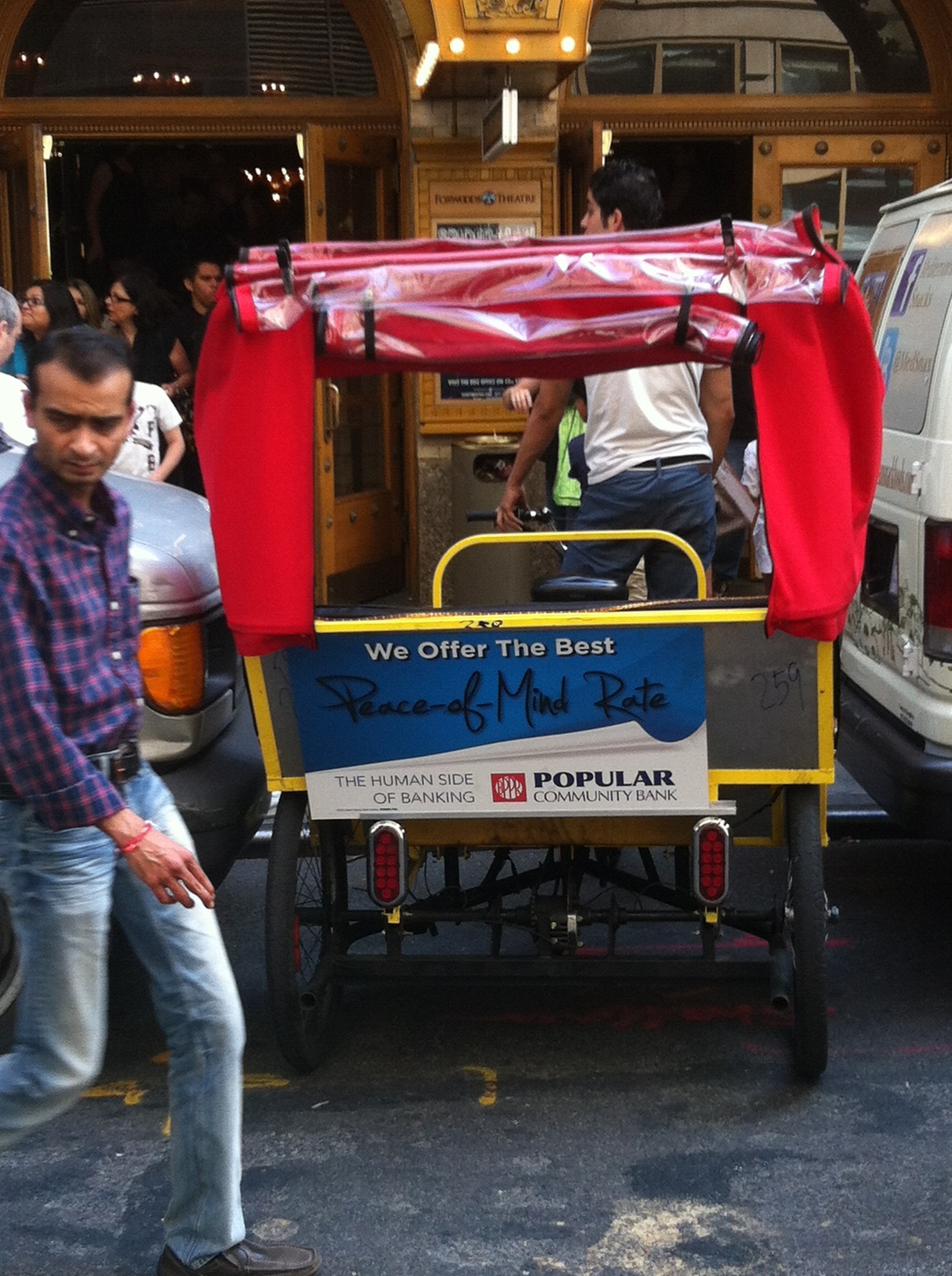 Ontem, no meio da maior onda de calor deste verão novaiorquino, saio de um teatro da Broadway em plena tarde – varando um ar quase irrespirável que se podia cortar com uma faca – e vejo-me cercado por…implorantes puxadores de riquixás que, com a competência marketeira do centro mundial do capitalismo, fechavam, com suas charretes puxadas a bicicleta, os espaços entre os carros estacionados, de tal forma que foi preciso andar um bom trecho rua abaixo até conseguir uma brecha para conseguir atravessa-la.