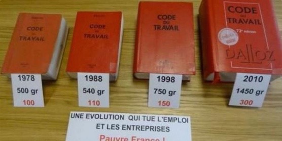 Montado ao longo de um século, o Code du Travail francês contém mais de 10 mil artigos. Das suas 3324 páginas, 170 regulam demissões, 420 tratam de questões de segurança e saude do trabalho, 50 cercam o trabalho temporário, 85 impõem regras sobre negociações coletivas, e vai por aí. Ha regras minuciosas para tópicos como salários, diferentes industrias, extensões multinacionais, tempo de interrupção para ir ao banheiro, o tamanho requerido das janelas, consumo de álcool no trabalho, como comer na mesa do escritório, regras para a emissão de emails em dias de semana e nos fins-de-semana, etc., etc., etc.